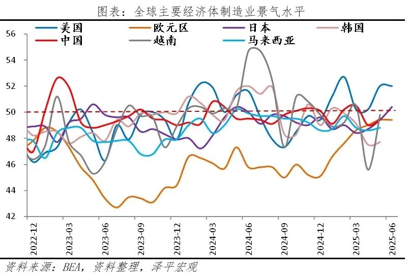 三是,全球经济放缓,发达国家进入“比烂”模式。IMF将2025年全球经济增速下调0.5个百分点至2.8%;OECD对经济预测下调至2.9%,较2024年3.3%的预测明显放缓。5月摩根大通全球制造业PMI较上月下滑0.2个百分点至49.6%。分区域看,欧洲经济虽在艰难恢复,但面临着通胀高企、能源转型阵痛以及地缘政治冲突的多重压力。6月欧盟消费者信心指数下滑至-14.8。IMF将2025年欧元区经济增速下调至0.8%。日本、韩国经济同样不容乐观,消费需求不足和外需低迷拖累一季度GDP。一季度日、韩GDP环比均下降0.2%。新兴市场国家也未能独善其身。全球金融环境的收紧使得新兴市场国家的融资成本大幅上升,资本外流压力加剧,货币贬值风险凸显。